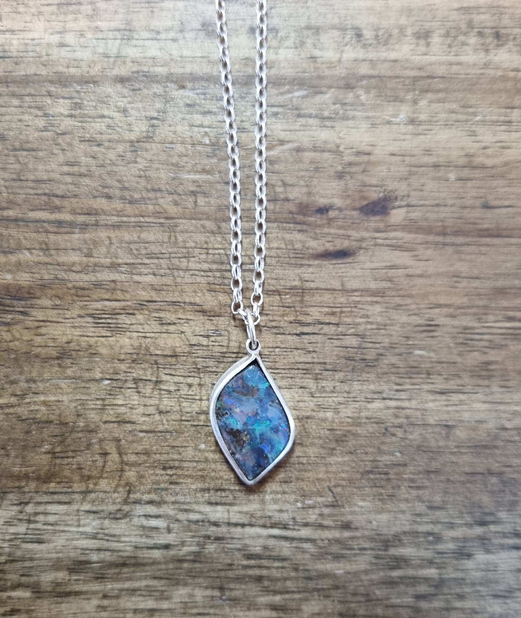 Beautiful flowy leaf shaped Australian boulder opal, in a handmade sterling silver setting.